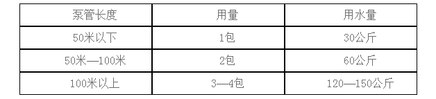 使用方法:可根據(jù)混凝土輸送設(shè)備的類型和輸送泵管的長度,參考下表用量進(jìn)行配置溶液。將本品倒入相應(yīng)體積的水中,攪拌2-4分鐘,使其充分溶解,當(dāng)溶液變的粘稠潤滑后即可使用。